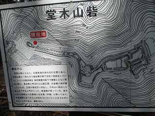 すると堂木山砦の案内板が見えてきた。この辺りの陣城の案内板は、城内のあちこちに縄張図が立てられており、現在地も示されているので、自分のいる位置が明らかとなるので、とても親切なものになっている。