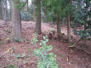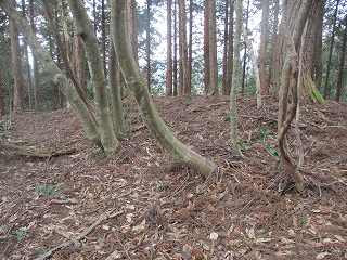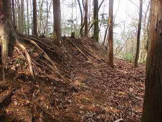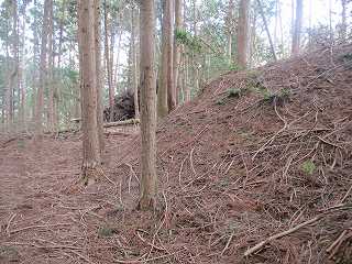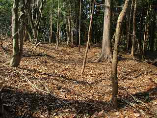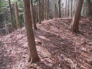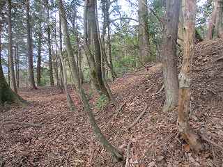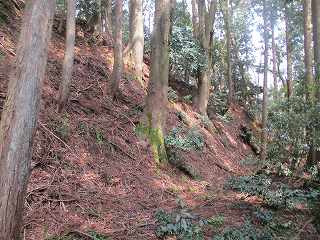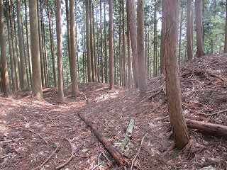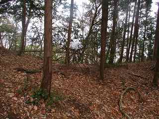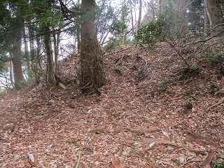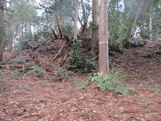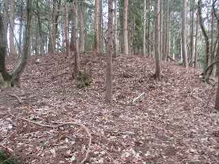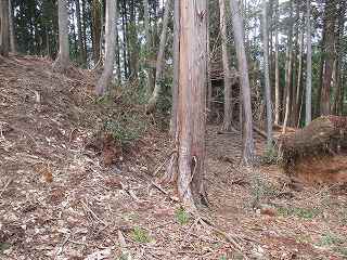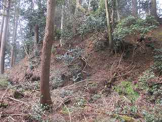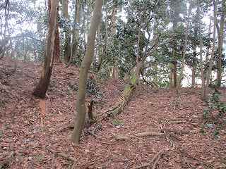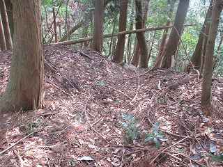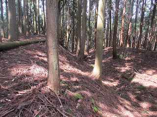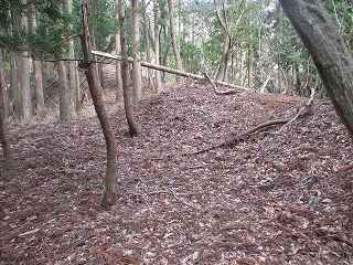 | 2郭との間の尾根には小規模な堀切が4本ほどある。 | 2郭東側の城塁。 |
