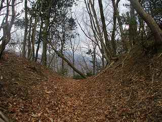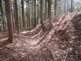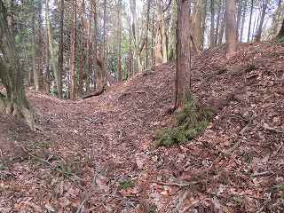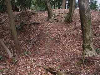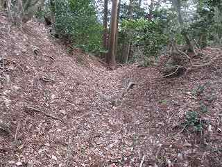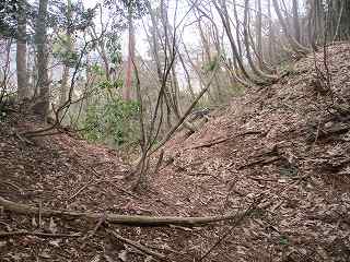 | 土塁によって通路は折れている。 | 虎口の1郭側の堀切。 |