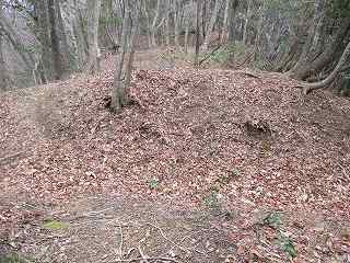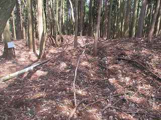 | 林道を進んで溝谷砦へ。このカーブの上が溝谷砦。 | 2郭と1郭城塁。 |