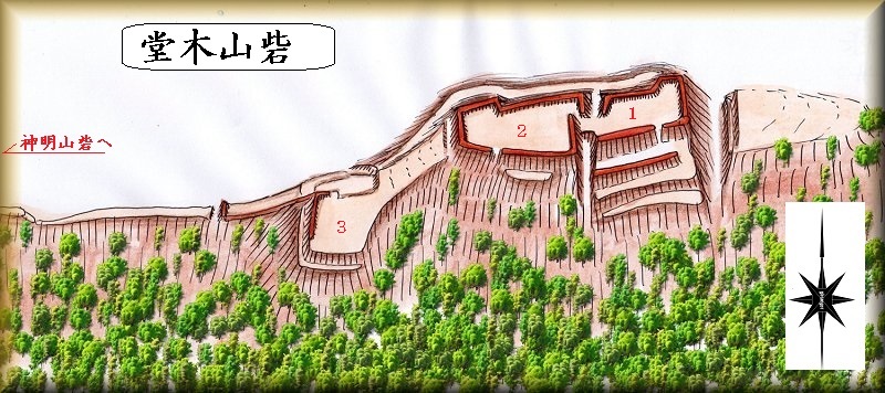 | 堂木山砦は、もともとは浅井氏の家臣であった東野越前守道義の居城であったと伝えられる。「堂木」という名称も、東野道義の「道義」からきているという説もあるが、定かではない。 天正11年(1583)の賎ヶ岳合戦では羽柴方の砦の1つとして使用されているので、この際に改修されたものと考えられる。 堂木山砦には、当時の長浜城主柴田勝豊の家臣の、山路正国、大金藤八郎らが布陣していた。 山路正国は柴田方の佐久間盛政の調略に遭い、寝返って堂木山砦から脱出していったため、その後、堂木山砦には木下半右衛門が入って守備した。 |