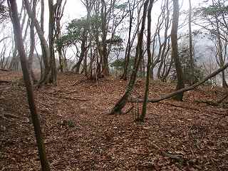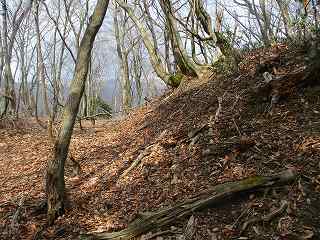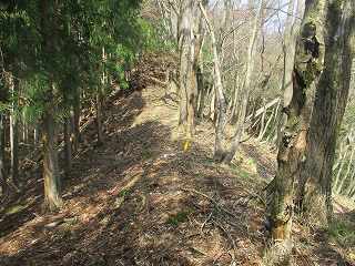 鉄塔の建っているところを抜けて、ひたすら西側の山稜を登って行く。砦までの距離はけっこうあるが、山稜はそれほど急峻ではなくヤブもないので、比較的歩きやすい。