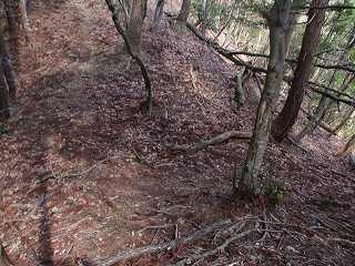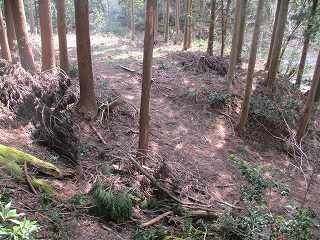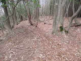 ここから西側の2郭までの尾根には小規模な堀切がいくつも掘られている。ところがちまちまとしていて、構造をはっきりと確認しづらくなっている。あるいは造成途中であったのかもしれない。また、倒木のために根がほじくり返されて改変されてしまっている個所も見られる。