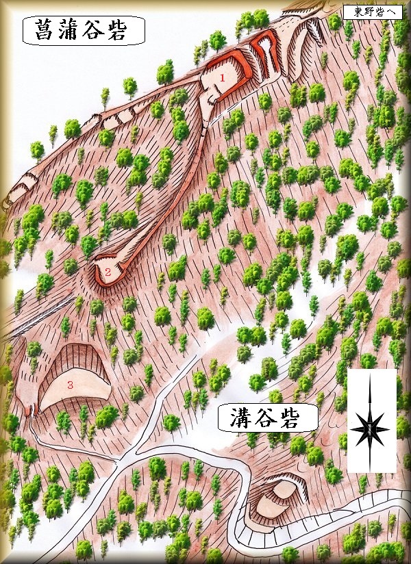 また、菖蒲谷砦下の林道を東側に進んだところには溝谷砦もある。溝谷砦の規模はかなり小さく、堀切によって区画された1郭の下に2郭を置き、その下に腰曲輪を配置しただけのものである。