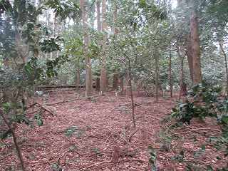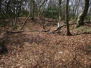| 2の内部。周囲に土塁が巡らされている。 | 2から尾根を登って1郭へ。 |
