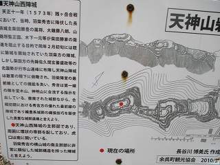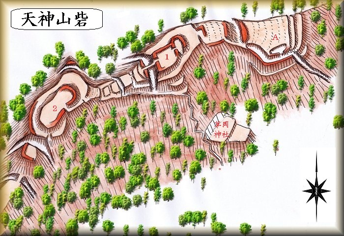 | 天神山砦も、賤ヶ岳合戦の際に羽柴勢によって築かれた陣城であった。 羽柴方に寝返った長浜城の柴田勝豊の家臣であった大金藤八郎、山路将監正国、木下一元らが、天神山砦の構築に当たったと言われている。 合戦が始まると柴田方の佐久間盛政が進軍し、行市山に陣取ったことから、天神山砦は地勢的に不利な位置に置かれることになってしまった。 そこで羽柴勢は天神山砦を放棄して、堂木山砦、神明山砦、菖蒲谷砦、東野山砦のラインまで前線を後退させていくことになる。 |
