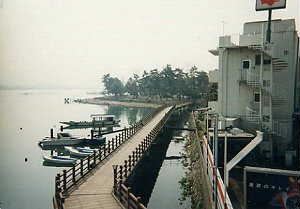 | 膳所城跡公園に架かる橋。城とは直接関係はないと思うが、なんとなく城らしい雰囲気をかもし出している。琵琶湖が朝もやでかすんでいる。 | 城址に復元された石垣と多聞櫓。公園内にはあやしい城風の建造物がいくつかある。写真は本丸から二の丸方面を見た所である。 |