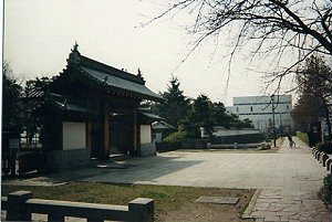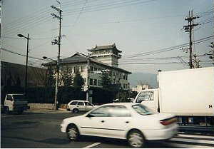 | 城跡公園の前にあるこの建物が、あやしい城の決定版であろう。なんとなく天守風であるが、これは役所であるらしい。 | 公園入り口にある城門。膳所城の城門は大津市の神社等に合計9門が移築されている。 |