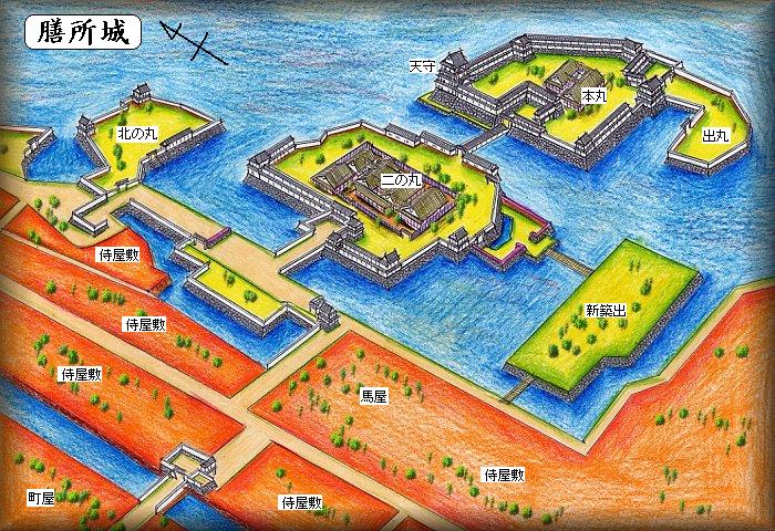 鳥瞰図は正保城絵図を参考にして描いてみたものである。湖水に突き出す半島状の地形を利用して本丸と二の丸が置かれていた。本丸の脇には出丸と呼ばれる付属的な郭もあった。本丸の広さは36m×45m、二の丸が65m×92mほどの大きさで近世城郭としてはささやかな規模である。二の丸の南には馬出しのような郭もあるが、正保年間より以降、ここに三の丸が設けられていたという。