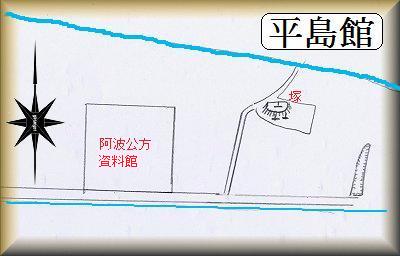 阿波公方資料館のある一帯が平島館の跡であるという。資料館のすぐ脇には塚が1つあり、その上に「平島館跡」の城址標柱が立てられている。また、下には古い墓がいくつもあった。