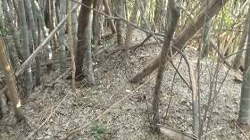 そこでいったん降ってから、八幡神社の背後から、途中の郭まで上がって行こうかと思ったのだが、こちらもヤブな上に急峻なので、これまたあきらめてしまった。