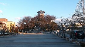 城址公園の東側には古墳のような規模の高台が1つあり、それが城の中心部であったらしい。ところが登ってみると、近代的なオブジェが散りばめられたしゃれた展望台となっており、城址らしいものはまったくといっていいほどない。面積もたいしてない。これではとても城址と言えないのではないだろうか。