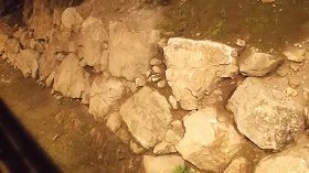 発掘された石垣は2段ほどのささやかなものであるが、石の粒はわりあい大きく立派なものである。積み方は乱積みであり、戦国期のものといってもよさそうなものである。しかし、石垣は高台の中央付近の所にあり、すぐ東側は台地端になってしまう。この位置からすると、現在の高台は東側がかなり削られてしまっているのではないだろうか。