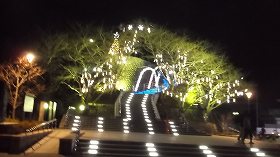 ところで、阿南市はLEDの生産で有名な都市なのだという。その関連で市内各地にLEDイルミネーションが設置されているのだという。この城址公園もその1つであり、夜になるとイルミネーションがきらびやかに輝き、「恋人たちの聖地」と呼ばれている、と阿南市のガイドブックに掲載されていた。例の高台にやたらとしゃれたオブジェクトがあり、イルミネーションが豊富に設置されていたのはそういうわけだったのである。