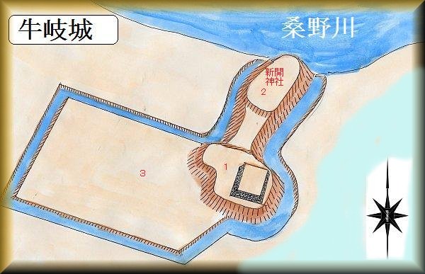 戦国期までの新開氏の牛岐城は、その規模は大きくなかったようで、1と2の瓢箪型の小さな台地に築かれたものであったらしい。1のピークが城の中心部であり、2の部分には新開氏を祭った神社が建てられている。