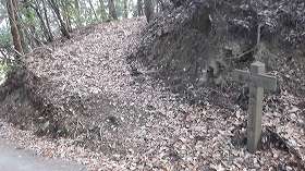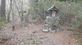 | 1郭北側の堀切。この先にも2本の堀切がある。 | 1郭櫓台上に祭られている祠。 |