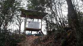 ここから急斜面を直登するように比高で100mほど登って行くと、やがて、先端の郭にある展望台が見えてきた。山道はさらに右手の側面部を進んでいく。すると斜面に2本ほどの浅い竪堀が掘られている。この先の部分から手前に戻るようにして登った所が展望台のある3郭である。