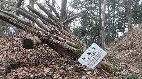 | 3郭にある展望台。 | 1郭南側の堀切脇に復元された逆茂木。倒れてしまっている。 |