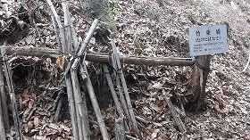 そこを進んでいったところが1郭先端部の堀切である。城塁は鋭くなかなか見ごたえのある堀切である。面白いのは、この堀切の脇に逆茂木や竹束楯などが設置されており、案内板も付けられているところである。こうした中世城郭遺構を復元するというのはなかなか面白い試みであると思うが、現在ではかなり朽ち果ててしまっている。