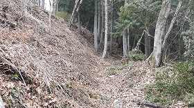 | 林道入口にある東山城登山口。 | 中腹の尾根には横堀状の通路が掘られている。 |
