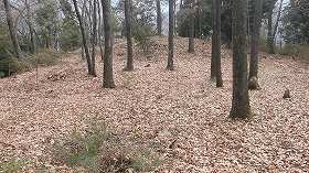 登り口から山道を進んでいくと、いったん尾根が平坦に延びている箇所に出る。この尾根を進んでいくと、尾根の側面部に横堀が長く掘られている。さらに斜面が登りになって行った辺りには、斜面脇に横堀状の切り通しが延びている。