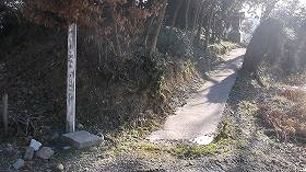 林道の登り口は2カ所あるが、東側からの方はもうだいぶ車が通っていないらしく道路に落ち葉がだいぶたまっていた。そのルートよりもこの位置から始まる林道の方が運転しやすいであろう。対向車もすれ違えないような林道であるが、道そのものはちゃんとしている。これを進んでいくと、この辺りの路肩に車が縦3列ほどに停められそうな箇所がある。ここに車を停めて尾根先端方向に進んで行った辺りに城址への登り口の案内が出ていた。この位置である。後は山道を進んでいけば城址に到達することができる。