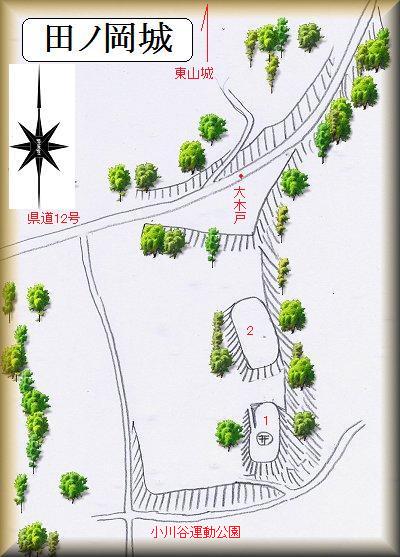 城の歴史もさっぱり分からない。田ノ岡刑部の居城であったというが、この人物のことも未詳である。現地案内板では「東山城の対の城」とある。「対の城」というと、東山城を攻撃する際の付け城といういみであろうが、付け城にしては少々近すぎるのではなかろうか。位置関係からすると、東山城の山麓居館と言った方がぴったりくる。