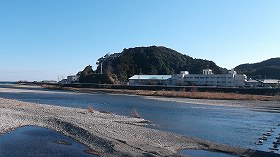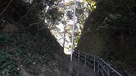 | 北側から見た海部城。海に臨んだ比高50mほどの独立山塊である。 | 中央登り口。立派な石段が付けられているが、これは避難用のものである。 |