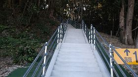 住宅地の中を進んでいくと、山に登っていくかなり立派な階段が見えてくるので「城址公園として整備されているようだ」と思い込んでしまうのだが、それは間違いであった。城山に何箇所からか付けられているこの階段は、津波の際に住民が山に迅速に避難するために設置されたもののようである。まだ新しいものであり、おそらく3.11の東日本大震災の影響を受けて設置されたものなのだと推測される。だから階段は城山の途中、ある程度の高さのところまでしか設置されておらず、そこから先の城内は、ほぼ未整備状態であった。