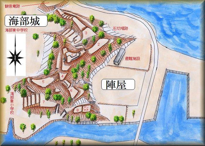 海部城は、海部駅の東400mほどのところにある比高50mほどの山稜に築かれている。三方向を海に囲まれており、まさに海城というべき城であった。また東側の山麓には近世に海部陣屋が置かれていた。