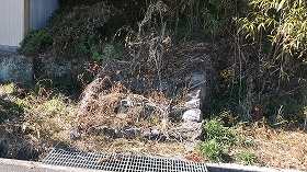 参道入り口の石段は民家脇のこの位置にある。よく観察すれば石段が見えているのだが、その先はヤブ状態である。神社の参道だというのにこの荒れようはひどい・・・。今ではこの道を使って参詣する人はいないようである。10mほどヤブを我慢して進んでいけば、後は普通の参道になるのであるが、そこまでがけっこう厳しい。