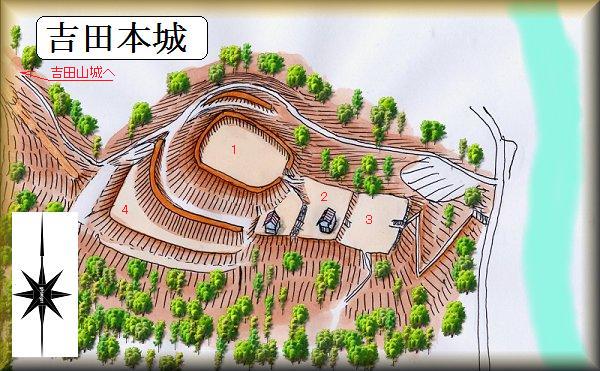 吉田城は、山麓地階部分にある本城と、そこから尾根伝いに登って行った先にある山城との2つの城郭により構成されている。