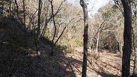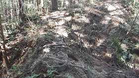 そこからは道が二手に分かれており、正面から比高20mほど直登すると3郭である。山道はそのまま続いていたので、とりあえず、山道を進んでいくと、やがて北側の山稜との間の堀切状の部分に出た。この先まで山道を進んでしまうと違う山の方に行ってしまいそうだったので、ここから3郭城塁をよじ登って行くことにした。ここから3郭に上がったところも虎口状になっていた。