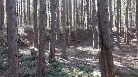 | 1郭内部。北側には土塁が盛られ、一部は櫓台状になっている。 | 1郭南側の堀切の城塁。 |