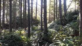 | 東側から遠望する吉田本城。手前の比高20mほどの台地である。中央やや左寄り奥の比高12mの山稜が吉田山城である。 | 民家脇にある春日神社の参道入口。しかし、途中かなりのヤブなので進入しにくい。 |