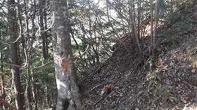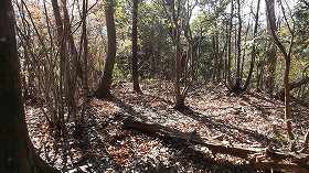 この部分を過ぎると道は切り通しではなく普通の山道になっている。またまたピーク部の側面部を通って進んでいくと、尾根が平坦になっているところに到着した。