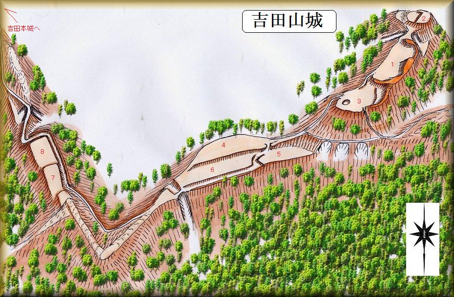 吉田山城はこのように山頂から中腹部にかけて広域に山稜を加工した山城である。郭面積もけっこうあり、相当数の人数の籠城も可能であり、城主の勢力の大きさを感じさせる。登城路とそこを通過する敵を攻撃するためのシステムもよく考えられている。ただ、これだけの山城であるというのに、案内板も何もなく、ほとんど未整備の状態である。世間からは忘れられつつある城址であるのだろう。ちょっと残念な気がする。