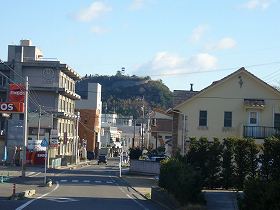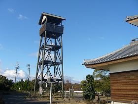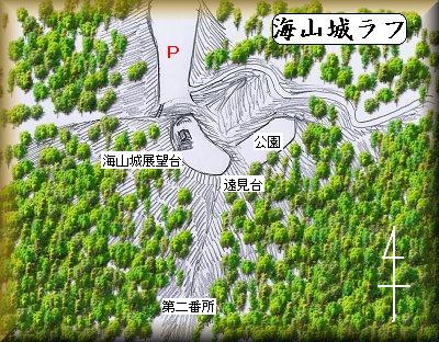 ところで、この展望台、町のどこからでも見える割には登り口が分かりづらい。実際、あちこち車で走り回ってみたのだが、どこから登ればいいのかなかなか分からなかった。ナビにも登る道は載っていない。そこで地元の人に聞いてやっと分かったのだが、西の運動公園の方からではなく(こちらから道がついているように遠目には見えるのであるが、これは車が上がれる道ではなかった。歩いて登るのならこちら側からでもいいのだが))、北東側の住宅街の辺りから上がれるのである。住宅街といえば、城址の東山麓には「海山城ハイツ」というまぎらわしい名前の住宅街があるので気をつけよう。「海山城」というのだから、この住宅街の奥から上がれるのかと思って探し回ったのだが、この住宅街の方からは登れない。国土地理院の地形図を見ると、北東側から登る道がちゃんとついているので、車の人はここから行くのがよいであろう。展望台のすぐ下の駐車場まで上がることができる。
