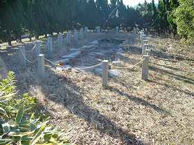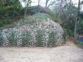 | 物見櫓。こういうのも中世城郭にあったのではないかと思われるが、こちらは鉄骨で汲まれているのがちょっと興ざめである。貯水槽をそれらしくみせようとしているのだろう。 | 岩ヶ嶺古墳。こんな山城の上にも古墳があるものなのだ。すでに盗掘されて石棺がむき出しになっている。 |