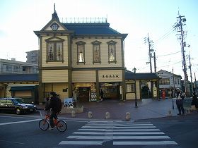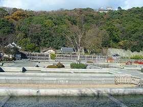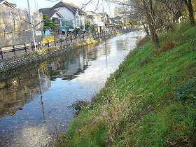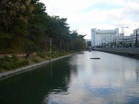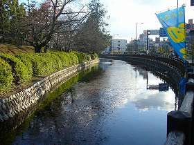 | 市電の道後温泉駅。観光地らしく瀟洒な建物である。このすぐ手前に城址がある。 | 北西側の外堀。きちんと循環させているのか、きれいな水である。 |