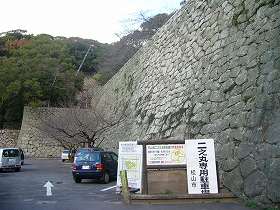 | 三の丸から見た二の丸の石垣と山上の櫓群。松山の町のどこからでも、山上の建造物を見ることができ、城下町だということをいやがうえでも印象付けられる。 | 二の丸の高石垣。この下が無料駐車場になっている。ちなみに駐車場になっているのは図の水堀部分である。 |