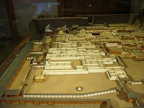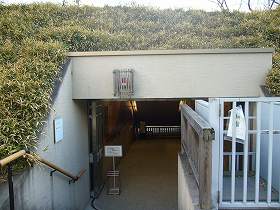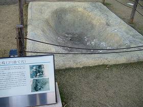 | 土塁の内部を見ることのできる展示室。なかなか面白い試みで、土塁が何層にも固められている様子を見ることができる。 | 復元区域内にあった土坑の跡。土坑の目的がなんであったのか、いろいろな説があるが、ここでは「ゴミ捨て穴」と明確に示してあった。なるほど、やはりゴミ捨て穴を見るのが、一番それらしいのかなあ。 |