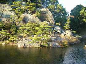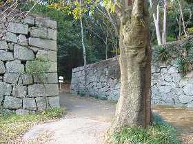 | 城山の南端部はこのように岩盤むき出しになっていた。ここも実は岩山だったのである。それにしても、この天然の岩が、庭園の素材となって、風景に妙にマッチしている。 | 東側の外堀の様子。おそらく最も旧状に近い部分であると思われる。なかなか見事な水堀である。土塁も高い。 |