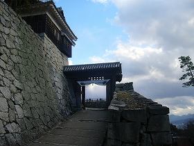 | 二の丸から山上に向かう道の入り口。これが本来の登城道であったという。 | 10分ほどで山上の郭までやってきた。大手門辺りから太鼓櫓を見たところ。登城道は何度も向きを変えながら進入するような構造になっている。 |