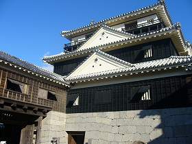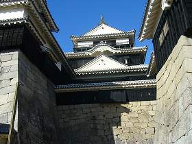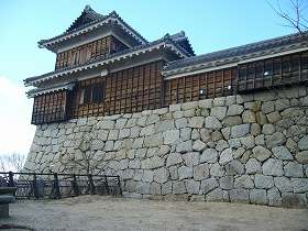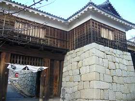 | (以前の記述)松山城は関ヶ原後に加藤嘉明によって築城された。当初の天守は五層あったと言うが、その後二度建て替えられ、現在の天守は、幕末の安政5年(1853)に完成したものだ。本丸には、ロープウェイで行こう。現在は2の丸等の復元工事が行われている。2の丸の堀周りは散歩するのにいいところだが、蓑虫がやたらと多いので、嫌いな人は注意。 | |