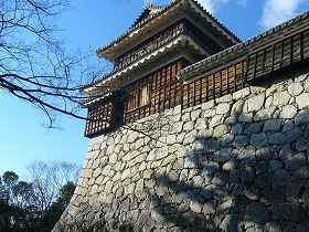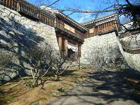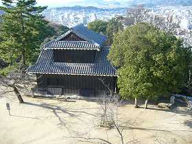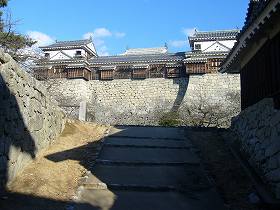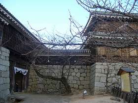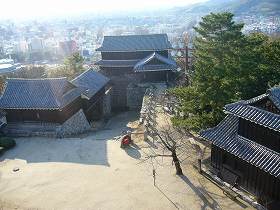 | 天守群内部から見た大天守。築城当時は5層天守がそびえていた。 | 天守群から西側下の乾櫓門を見たところ。 |