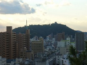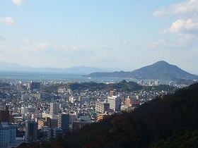 | 太鼓門を上がって天守櫓群を見たところ。この日、台風のような風が吹いていたので、山上は砂埃がひどいし、油断していると吹き飛ばされそうになってしまう。 | 山上の本丸から瀬戸内海方向を見たところ。景色はすこぶるよい。 |
