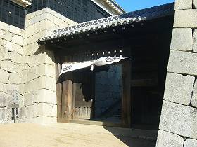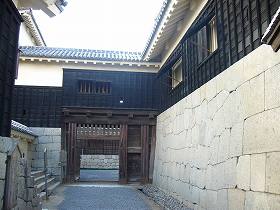 | 太鼓櫓の下のUターンしてこの門をくぐらなければならない。 | その先が筒井門である。この門の右側には隠れ門がある。どうして門が2つ並んでいるか。1つは不浄門のようなものであったのだろうか。 |