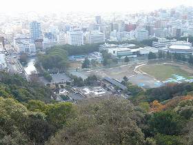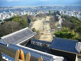 | 小天守から見おろす二の丸と三の丸。中央やや左側が二の丸、グランドや役所になっているのが三の丸である。 | 天守最上層から、本丸内部を見たところ。 |