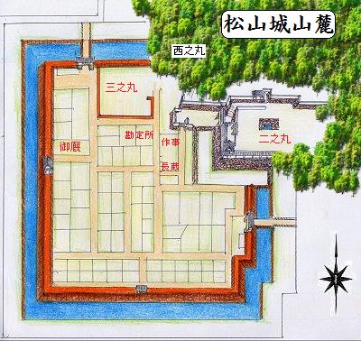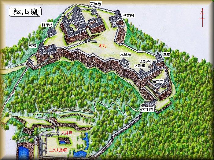 城は山上の部分と、山麓の部分の2つから成っている。平地にそびえる独立峰を城内に取り込むといった形式は、徳島城、丸亀城などと共通しているが、あるいはそれは四国という地形的な共通性によるものであるのかもしれない。松山城の場合は、山上の部分全体が本丸、山麓の居館部が二の丸、さらに政庁や侍屋敷などが置かれていた広大な平場の部分を三の丸と呼んでいる。実に大雑把な区分の仕方であり、山上の複雑に組み合わされた郭がすべてで「本丸」というのも、なんともざっくばらんな印象である。